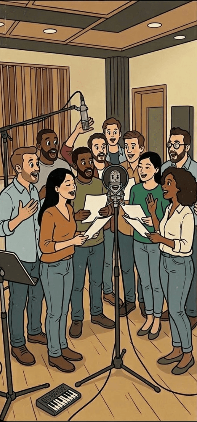 Artificially created Loop Group Session with digital replicas of professional performers.